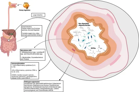 العسل ليس مجرد غذاء حلو، بل قد يعمل كبريبايوتك طبيعي يدعم صحة الأمعاء. يساعد على تقليل البكتيريا الضارة، تعزيز نمو البكتيريا النافعة، تخفيف الالتهابات، وحماية من أمراض الجهاز الهضمي. رغم أن الأدلة من التجارب على الحيوانات والمختبر قوية، إلا أن الأبحاث على البشر ما زالت محدودة وتحتاج لتوسّع.